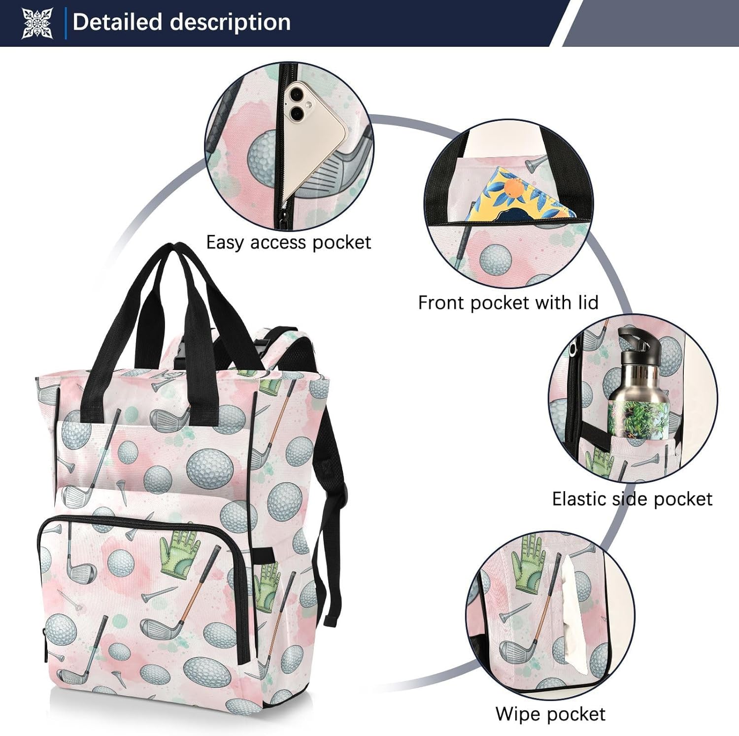 Golf Ball Pastel spacious and practical baby diaper backpack, a must-have for every modern parent! Why choose us? ✔Sturdy ✔Large Capacity ✔Paper Pocket ✔Thermal Pocket - Keep the milk warm ✔Back Zipper Pocket ✔Side Bottle Pockets ✔Luggage Strap ✔Stroller Straps ✔Unique Design ✔Ideal Gift Product Details Material: Polyester Fabric Dimensions: 11.02 x 5.91 x 15.3 inches(28 x 15 x 39cm) and offers a generous capacity of about 10 liters Package Included: 1 x diaper bag Way for use: Can use as backpack for ladies, handbag for women, Tote bag, elegant and suitable for many occasion like shopping, traveling etc.Practical and Unisex Design make this diaper bag backpack perfect for travel with your son and daughter. Good Gift: It is an ideal gift choice for baby showers, baby registries, Mother's Day, Thanksgiving, or Christmas. Show your care and thoughtfulness to your female friends or loved ones with this versatile and fashionable bag. JU005