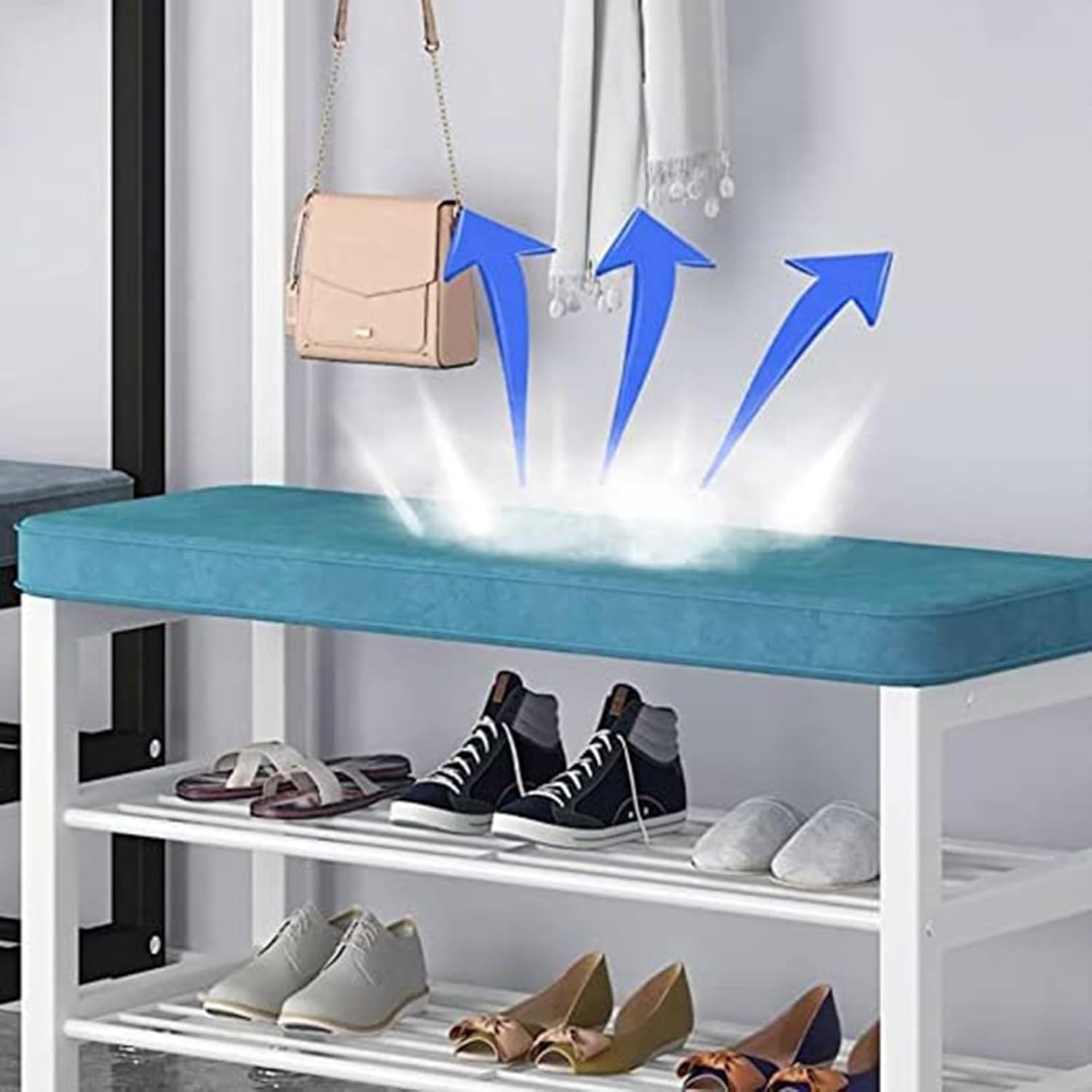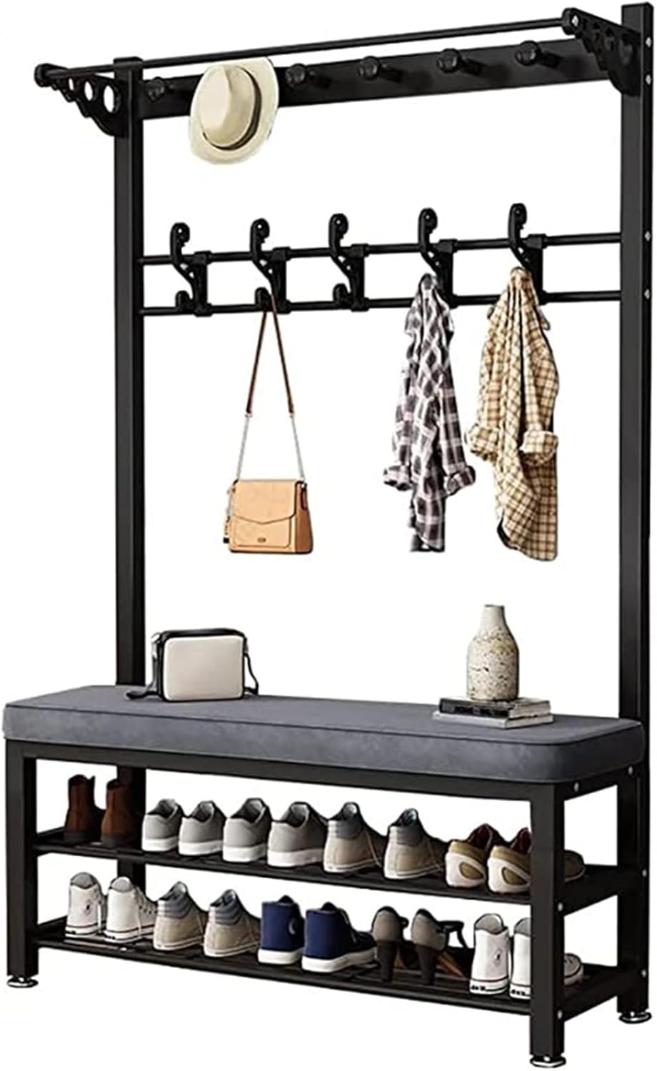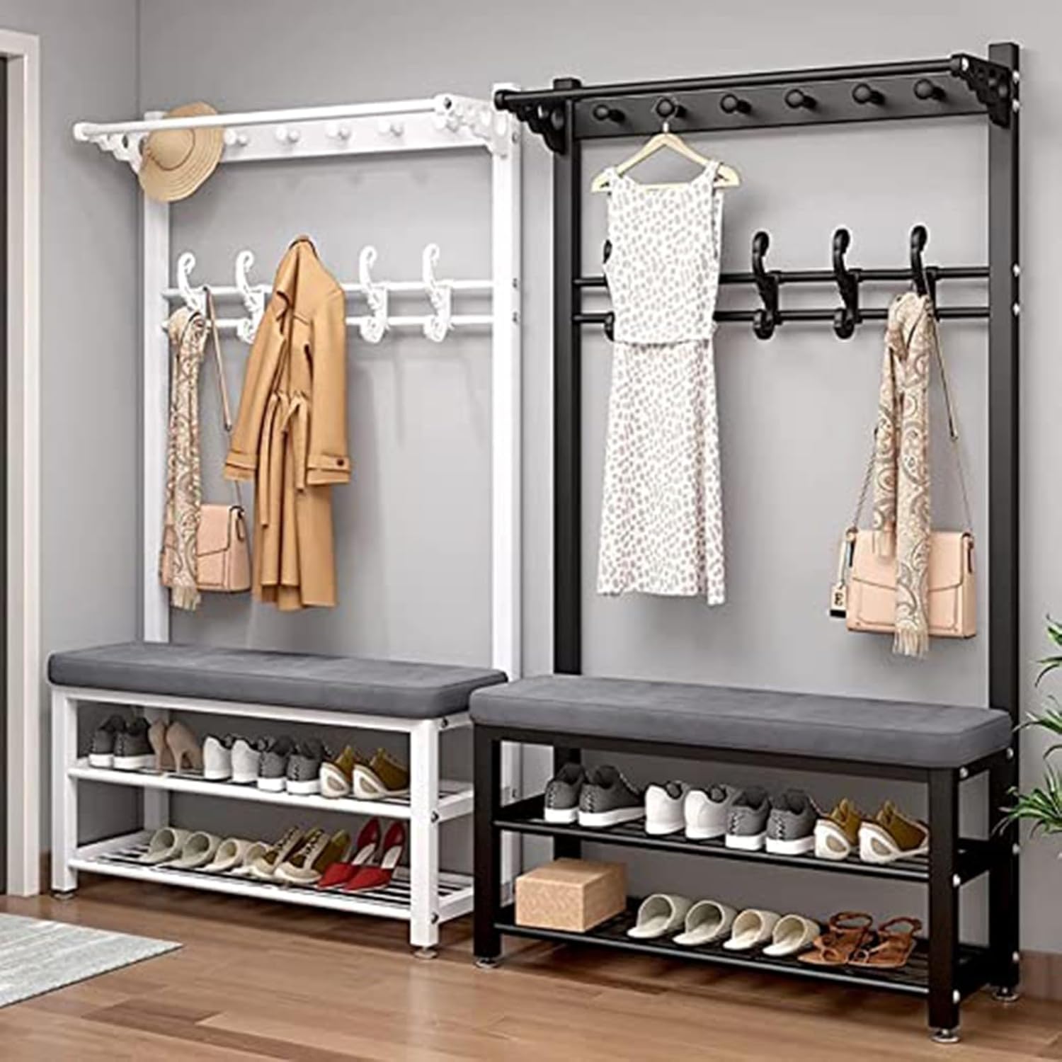 Enhance your home nization with this versatile 4-in-1 metal cobbler stool and clothes rack. Whether you need a coat rack, shoemaker's stool, or multi-functional furniture, this product is designed to meet all your home needs. Made of sturdy and metal, it ensures a long service life and can support up to 100 kg, providing you with a stable and reliable seating option. The multifunctional design allows you to store shoes, hang clothes, or simply sit back and relax. With dimensions of 60/80/100*33*172CM and 8 hooks, this coat rack is perfect for maximizing your storage space. Assembly is required, but the process is straightforward follow. Please note that there may be slight size differences (1-3cm) due to manual measurement, and color variations may occur due to different shooting equipment and monitor settings. The product includes 1 coat rack only, and any small background items or decorations shown in the pictures are not included.