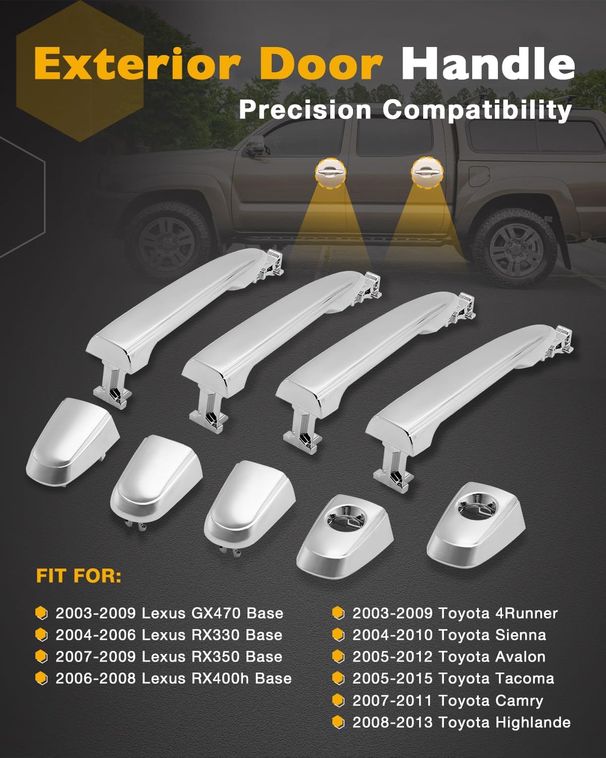Packing List:4 x Exterior Door Handle Grips2 x Finish Cover with Key Hole(Front Left Driver Or Right Passenger Side)1 x Finish Cover without Key Hole(Front Right Passenger Side)2 x Finish Cover without Key Hole(Rear Driver or Passenger side)Condition: NewCompatible with:2003-2009 Toyota 4Runner2004-2010 Toyota Sienna2005-2012 Toyota Avalon2005-2015 Toyota Tacoma2007-2011 Toyota Camry2008-2013 Toyota Highlander2003-2009 Lexus GX470 Base2004-2006 Lexus RX330 Base2007-2009 Lexus RX350 Base2006-2008 Lexus RX400h BasePrecise Fit Part Numbers:4 x (Handle Grips) : 69211AE0102 x (Driver Side Finish Cover with Key Hole) : FDH0102911 x (Passenger Side Finish Cover without Key Hole) : FDH010292, 6921128070, 692170E010C02 x (Rear Left or Right Side Finish Cover) : 69227AE020C1, 14908001TO1310143, 82499, 82498, 93994,82495Broken door handle? Can't get in your car? Are you searching for the highest quality, best replacement value door handle? We deserve it. Our Door Handle kit, to replace your old or broken part, will meet or exceed OEM standards.