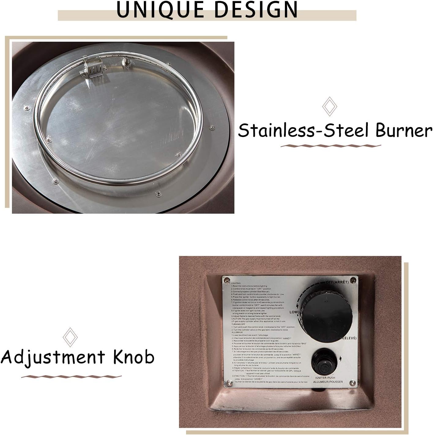 Product descriptionWelcome to Hompus! We are always working hard for you to create a awesome atmosphere for outdoor activities, high quality and comfort are our unremitting goals. What you will get: Main Frame of Fire Table x 1 Glass Wind Guard x 1 10-Pound Gray Fire Glass x 3 AAA Battery x 1 Rain Cover x 1 Metal Fixator X 1 Product Dimensions:** Fire table: 42''D x 13''H ** Burner: 27''D ** Wind Guard: 27'' D x 6'' H Note: There is a silicone pad at the link of the glass guard which we use to protect the glass during transportation. Please remove it before use Since the product you ordered is relatively large, we will divide your order into 3 packages to arrange transportation. If you have any questions, please feel free to contact us, we will reply you within 24H