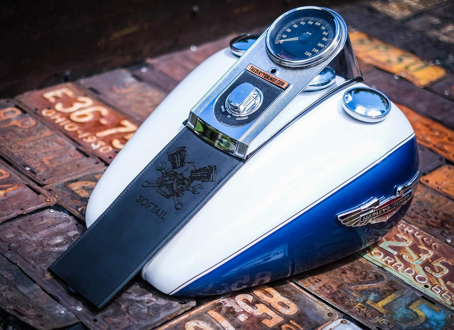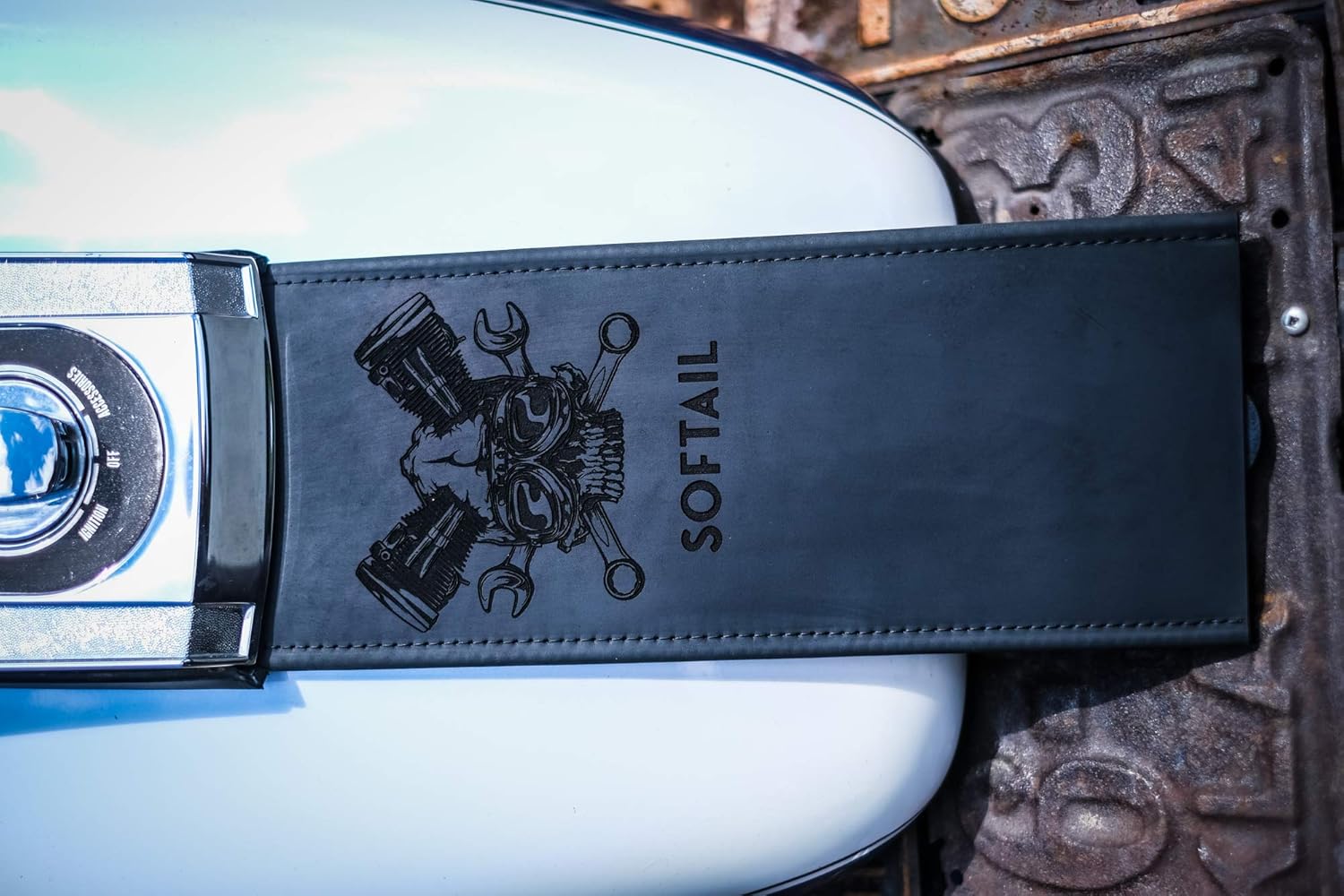 Precision laser cut and engraved dual layer 100% leather - quality Compatible with Harley Davidson Fuel Tank Bib Panel. Hole Locations are for: 1993-1903 FXDWG 2000-2017 Softail (Except FLS, FLSS, FLSTNSE, FLSTSB, FLSTSE, FXCW, FXCWC, FXSB, FXSBSE, FXSE, FXSTD, FXSTSSE, 2006 FLSTSSE and 2009-2017 FLSTC) Can fit early model split tanks, just poke your one hole up higher than the bottom slotted one provided. Top shelf leather from our local supplier. Professionally laser engaged, proper double-thick leather back-panel, sewn and built by some folks who truly love bikes and the open road. 100% leather on both sides, wont scratch paint. Made in USA. They look great when installed, last years and will certainly set your bike apart.