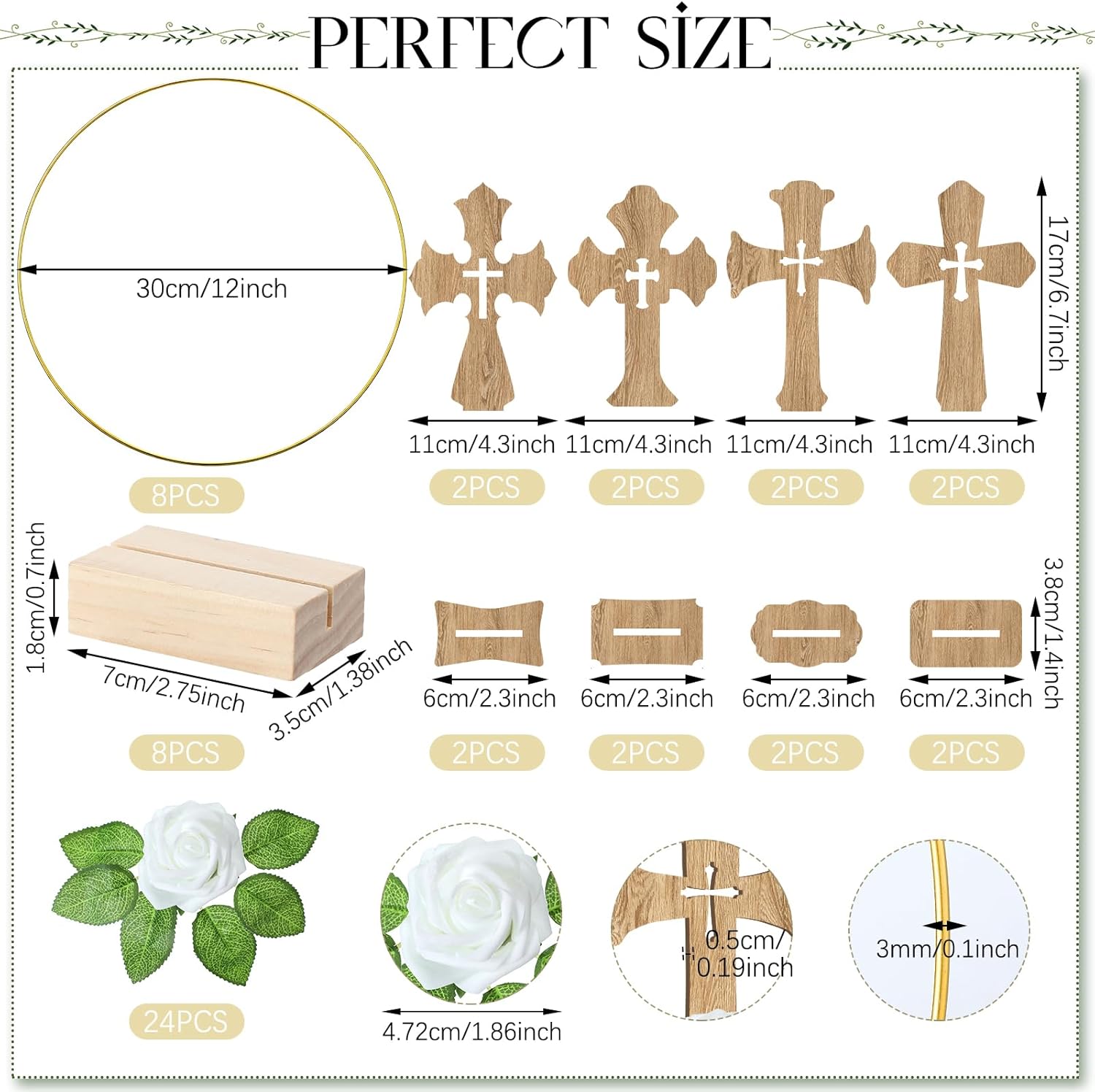 Features: These gold metal hoops for floral can be applied to DIY table decorations at home, office, dorm, cafe, market, restaurant, hotel, dining room, living room and more, and suitable for the wedding, party, baby shower, bridal shower, first communion or other festival, to create a romantic and warm atmosphere. The 12 inch metal floral hoop and wooden cross for table are equipped with sturdy bases, and have not been assembled in advance, so it will take you a little time and energy to install them, simple to operate for most people. Specifications: Gold metal hoop centerpiece Material: metal, wooden base Color: gold, wood color Size: approx. 12 inches/ 30 cm in diameter Wooden cross Material: wood Color: tan Size: Cross: approx. 6.69 x 4.33 inches/ 17 x 11 cm in height and width Base: approx. 1.97 x 1.18 inches/ 5 x 3 cm in length and width White faux rose Main material: plastic Color: white Size of flower head: approx. 1.86 inches/ 4.72 cm in diameter Package includes: 8 x Gold hoop centerpiece with stand 8 x Standing wood cross with wooden base 24 x White fake roses Notes: Manual measurement, please allow slight errors on size. The color may exist a slight difference due to different screen displays.