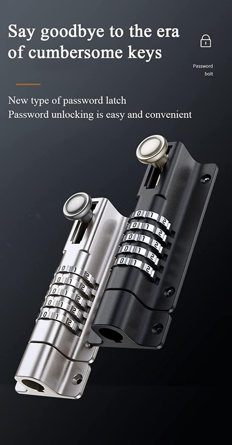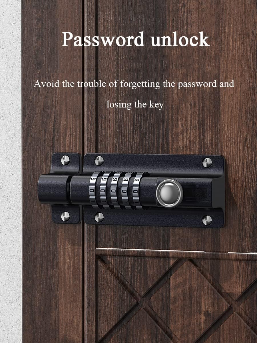 Product Parameters*Commodity name:Password latchColor:Matte Black/Streamer SilverProcess: wire drawingMateria: stainless steel / zinc alloyInstallation method: punching/no nails*Set Your Own Combination*Operation sequence*Step 1: Initial password 0-0-0-0, modify the password based on the correct password*Step 2: Toggle the switch to pull back to point A, and pull up to point B*Step 3: Turn the code wheel to set the number you want, such as 1-1-0-0*Step 4: Don‘t move the set number, return the operating lever to the origin, and the password is set successfully*Product Description*Our recodeable combination locking bolt offers convenience of keyless security with 10,000 possible combinations and no need to hassle with keys.*It is a flexible solution for securing equipment, tools, livestock, doors and even windows.*Why choose us*We always pay attention to product quality, provide every customer with the best product quality.If you have any questions about the product, please feel free to contact us.