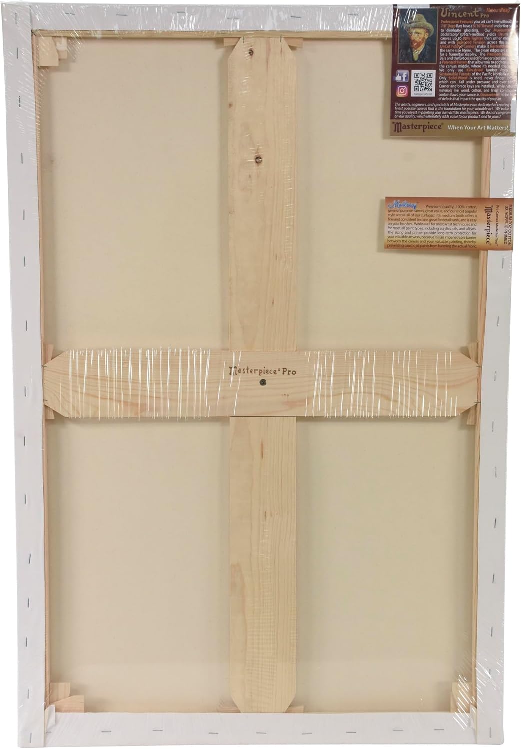 Product Description This 24x24 is of equal proportion. Belgian Linen - primed weight: 14.1 oz.. It's double sized and quad primed with an archival quality oil primer, impervious to paints leaching through that harm the fabric. For oils or alkyds only. It's highly absorbent and has excellent qualities of luminosity. It has a warm yellowish hue and is an exceptionally smooth surface! Linen is strong and it's natural oils keep it flexible and prevents disintegration. The luxuriously smooth surface is perfect for portraits and detail type work. There is a 5/16" gap between the canvas and frame, eliminating the unwanted lines that occur when the gap is less. We never use finger joints in our wood frames, which often fail under tension and over time - the glue joints give up, and are unsuitable for paintings intended to last for centuries. Patented 3.25" wide heavy duty keyable cross braces allow the canvas frame to be tensioned in the middle, where the tension is needed the most! The Stretcher Bars are slotted in the center to accept the cross braces. Due to our unique design, the cross braces provide maximum rigidity and may be removed, if desired. Both corner keys and brace keys are pre-installed. Stretched using our proprietary MuseumWrap method, producing a drum-tight-stretch, up to 50% tighter than other methods, and with balanced tension across the surface. The corners are uncut and neatly folded, making it possible to remove and restretch the canvas on the same size frame. From the Manufacturer For 50+ years, the passion of the Masterpiece team is building the finest artist canvas in America. Just touch one of these impressive products and you’ll immediately discern the quality characteristics that separate this canvas from any other. Masterpiece takes pride in using high quality materials, employing unparalleled workmanship, and continually upping the bar on quality. The importance of artists using a quality made canvas cannot be overstressed. If you use high quality paints and brushes, then don’t waste your resources on an inferior canvas not worthy of your own time, talent, and reputation.Masterpiece canvases are built to last well beyond the artist's lifetime…into the next millennium. Savvy art buyers and art enthusiasts understand that the value of a painting increases when the materials used to create it are of equal quality to the artwork itself. Using a well-made canvas is an investment in your own legacy.Why are Masterpiece canvases so good? It starts with the canvas itself. Natural fiber canvas materials, like 100% cotton and Belgian Linen, are selected and inspected. A sizing is then applied to the canvas that becomes a barrier between the ultimate primer and the canvas material. The primer is specifically designed to provide the ultimate surface upon which your paints will join with the canvas, either chemically and/or mechanically, providing a reliable base or ground for your art.The canvas is then mounted onto a state-of-the-art Vincent Pro frame. When frame sizes are 16” or larger, a brace is applied to the frame; for example, a 12x16 has a single brace, and a 16x16 is cross braced in both directions. The braces prevent the stretcher bar frame from bowing-in so the canvas stays tighter….which is a welcome feature when you paint on the canvas, making the surface more responsive to the artist’s touch. And the canvas stays tight after it’s painted. To increase the tension further, press-in the corner keys and the brace keys further into the slots, which adds tension in the corners and the middle of the canvas, where the tension is needed the most!Vincent Pro canvas is MuseumWrapped, which is Masterpiece’s proprietary stretching technique that achieves: a drum-tight stretch, balanced tension across the canvas surface, neatly folded un-cut corners, and paintable edges. It’s the absolute best way to stretch a canvas.When your art matters, choose Vincent Pro…a truly professional canvas in every way!