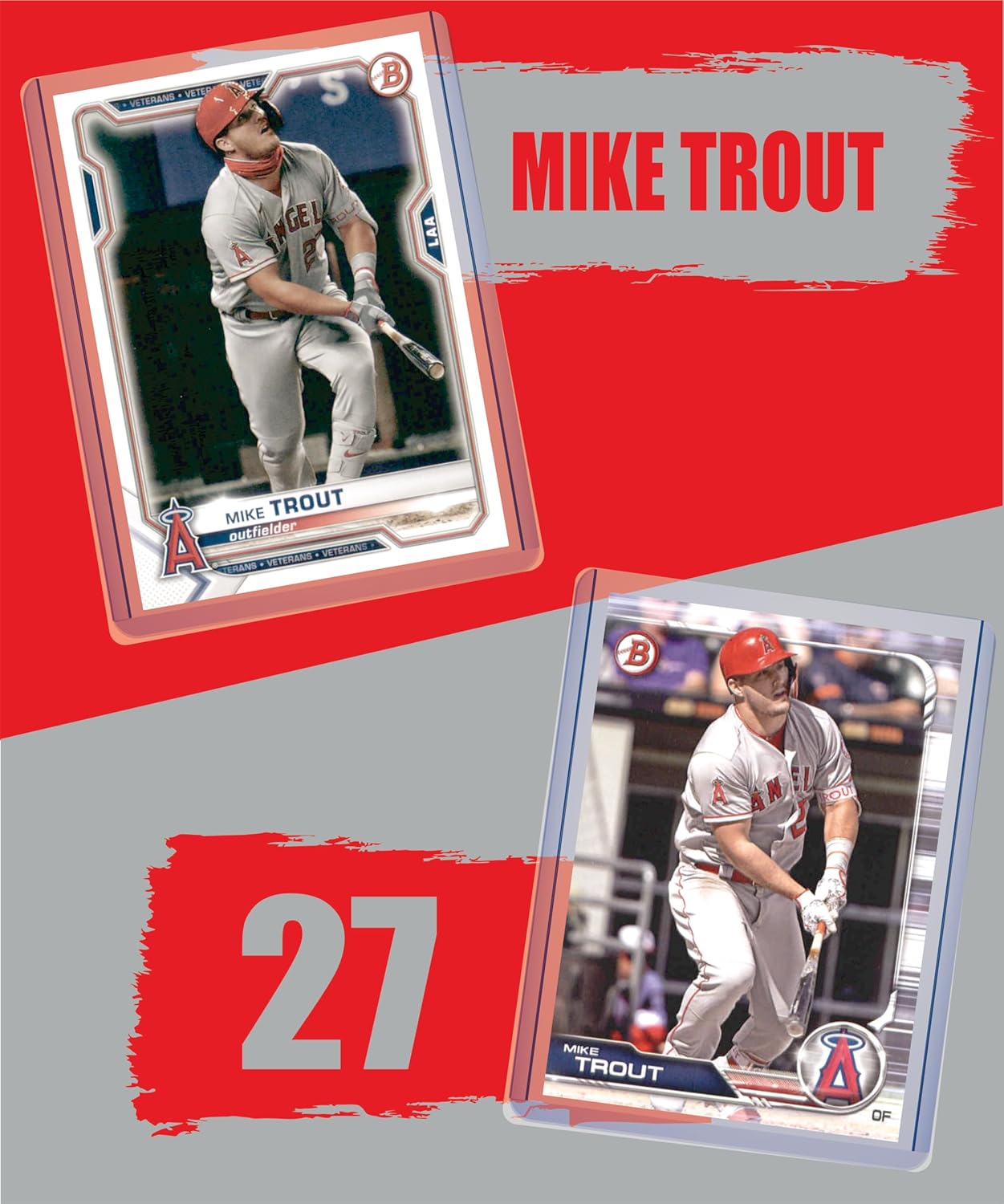 Grab this great lot of one of the top baseball players, Mike Trout! Guaranteed to contain 10 authentic, licensed baseball trading cards of Mike Trout. Exact assortment varies and cards will be in Los Angeles Angels uniforms. Each card comes in a protective sleeve and toploader case. The group comes in a gift bag with assorted color bracelets. Great for gift giving for collector's young and old.