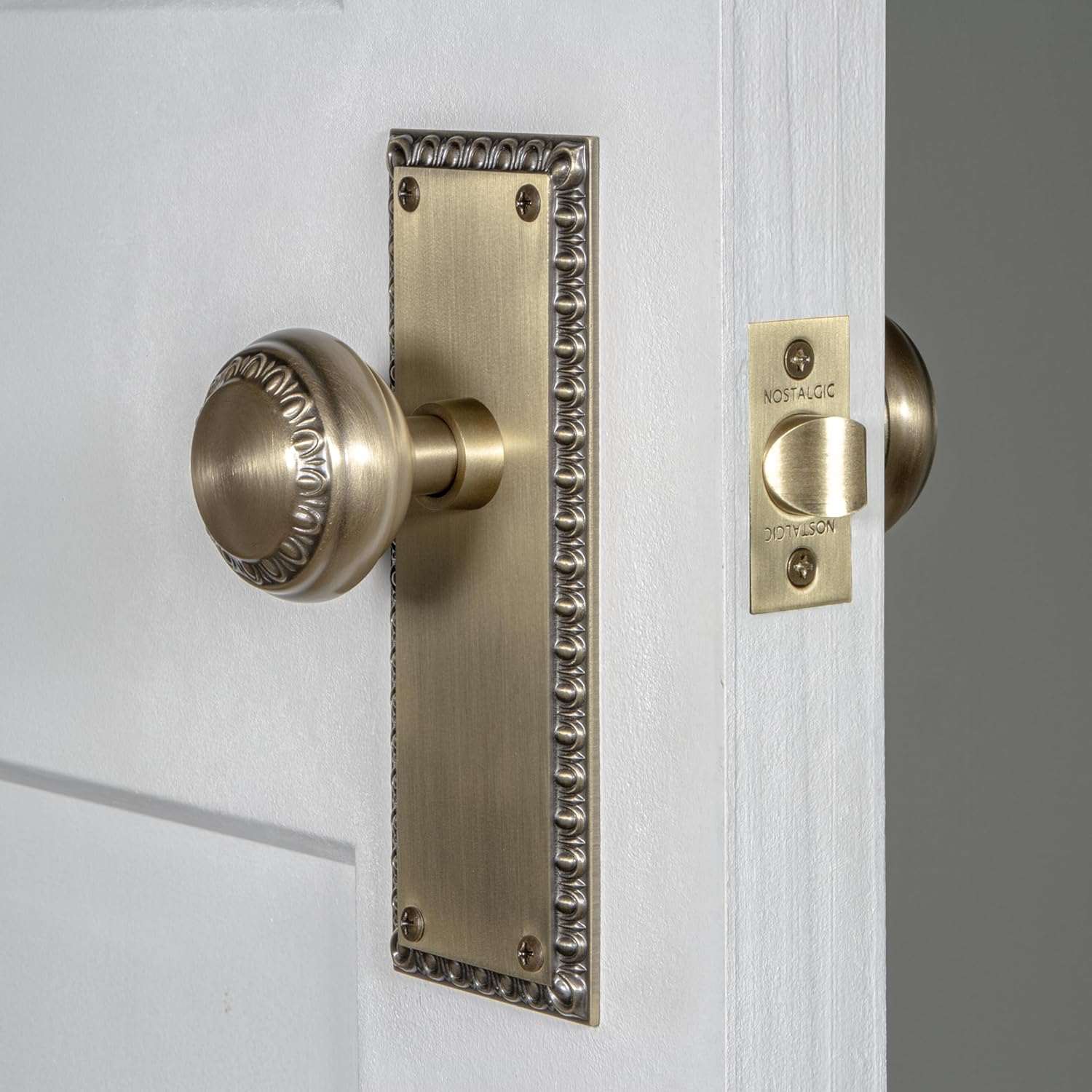Embrace the elegance of bygone eras with the Neoclassical plate and door knob from Nostalgic Warehouse. This door hardware piece merges the delicate floral crown and distinctive swirl design that defines classic elegance with a touch of sophistication. Perfect for those seeking to add a vintage or antique flair to their doors, the Neoclassical collection pays homage to the rich architectural history while ensuring modern functionality. This design not only stands out for its aesthetic appeal but also benefits from the durability of both doorknob and back plate being made of solid brass. Solid brass is well-known for its strength and ability to hold fine details, making it the perfect material for crafting the intricate Egg & Dart pattern. Whether renovating a historic home or infusing a new build with character, this door hardware set elevates your space with its unmatched beauty and quality craftsmanship.