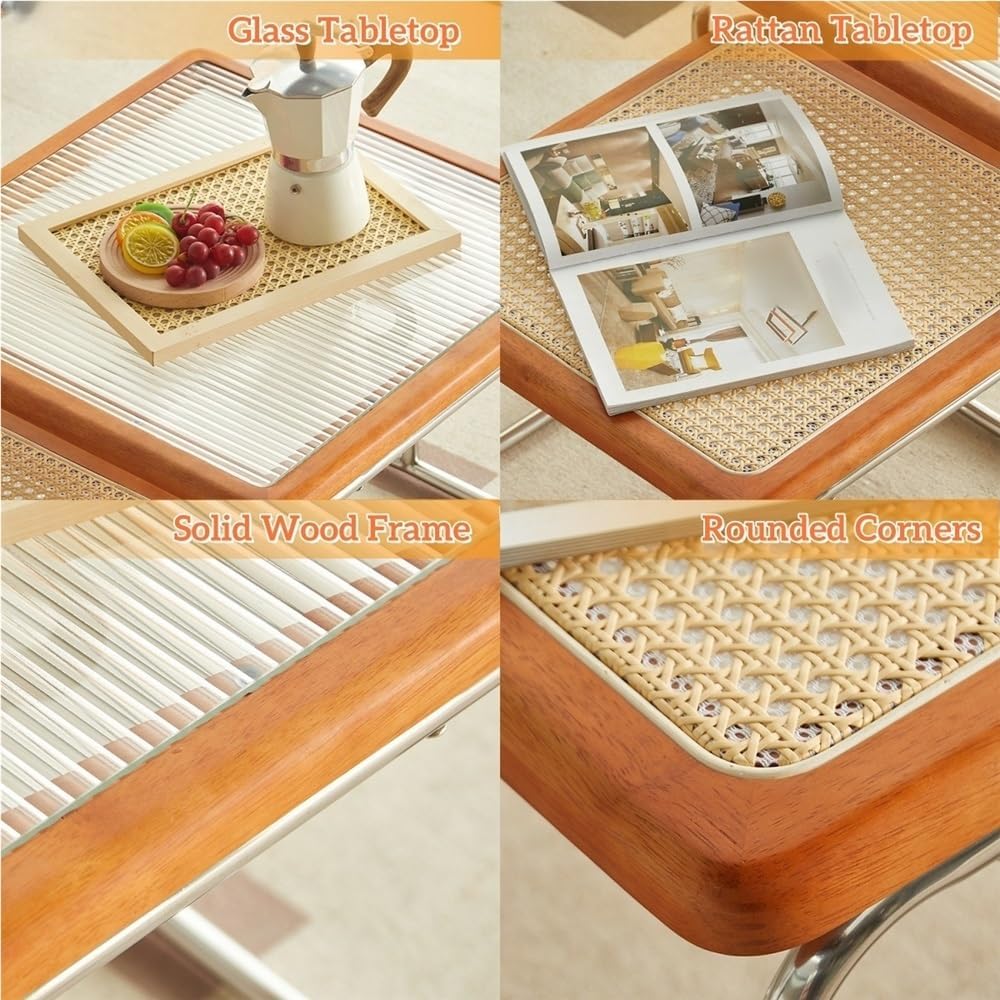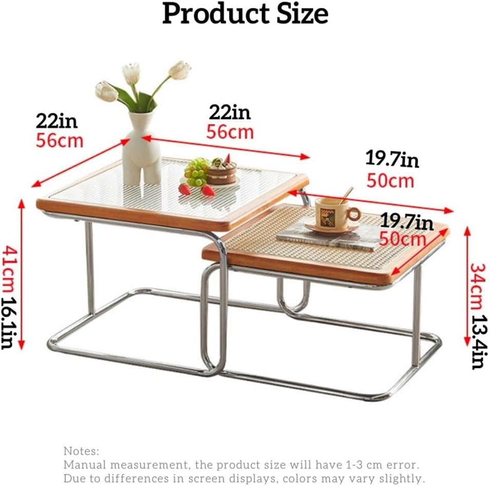 This nesting table set is designed for durability and sophistication, featuring a tabletop made from woven rattan and tempered glass. These materials provide a stylish yet resilient surface that withstands daily wear and tear. The solid wood frame adds a strong foundation, while the thickened steel tube legs offer enhanced stability, making these tables a reliable choice for any living space. Whether used as a coffee table or side table, this set is suitable for high-traffic areas, ensuring long-lasting use and a touch of sophistication to your decor.Maximize your space with this versatile nesting table set. The tables can be stacked to conserve space or separated to create additional surface areas, allowing you to customize your living area to suit your needs. Use them together for a cohesive look, or individually in different rooms as side tables or nightstand.With their compact size and lightweight design, these nesting tables are incredibly easy to move and versatile enough for both indoor and outdoor use. Suitable for living rooms, patios, gardens, balconies, or even as additional side tables in your bedroom or office, this set adapts to a variety of environments. Whether you're hosting guests, enjoying a quiet evening outside, or need extra table space for daily use, this table set is a stylish and functional addition to any setting.Product Name: Square Coffee Table Set of 2Color: Black , BrownSize: 22" x 22" x 16.1'' and 19.7" x 19.7" x 13.4'' (L x W x H)Style: Modern, Minimalism, Rural, IndustrialApplicable scenarios: Living room, bedroom, apartment, office or morePackage List: 2 x TableTips:The size is measured manually, there may be a slight difference of 1-2 inches.If you have any questions or concerns, our customer support team is available to assist you within 24 hours, giving you peace of mind with your purchase.
