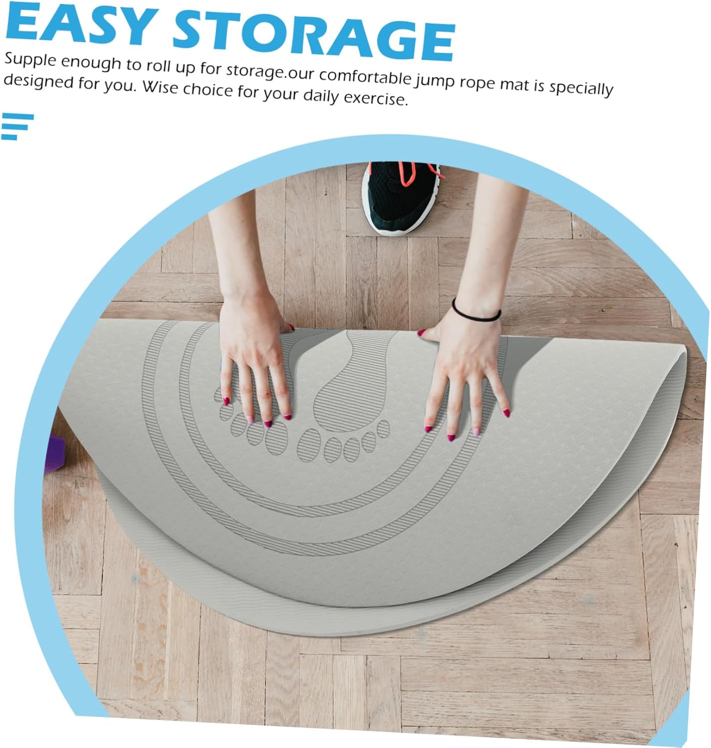 Package Include 1 x jump rope mat Characteristics -Material: TPE outdoor rope floormat. -Product Info:Anti-slip skipping rope mat -Lightweight and non-slip design cushions make exercise easier and safer to use jump rope mat indoor. -You can spread these elastic cushions for daily exercises, strenuous exercise and other occasions jump rope and mat. -This jumping mat is an extra boost that adds a new dimension to your workout skipping rope mat. -The mat can reduce foot and reduce fatigue during jumping or exercise jump rope mat. -Shocking absorption, better mute effect, skipping rope at home can prevent the sound from disturbing the neighbors circle jump rope mat.Goods Informationtpe floor mats Made of TPE material, this mat is durable for use.jump rope mat Appropriate size and thickness ensures comfort for people jumping rope, performing yoga, hot yoga, aerobic, fitness or stretching routines.circle jump rope mat Elegant color design, it is also a fashion and attractive workout cushion