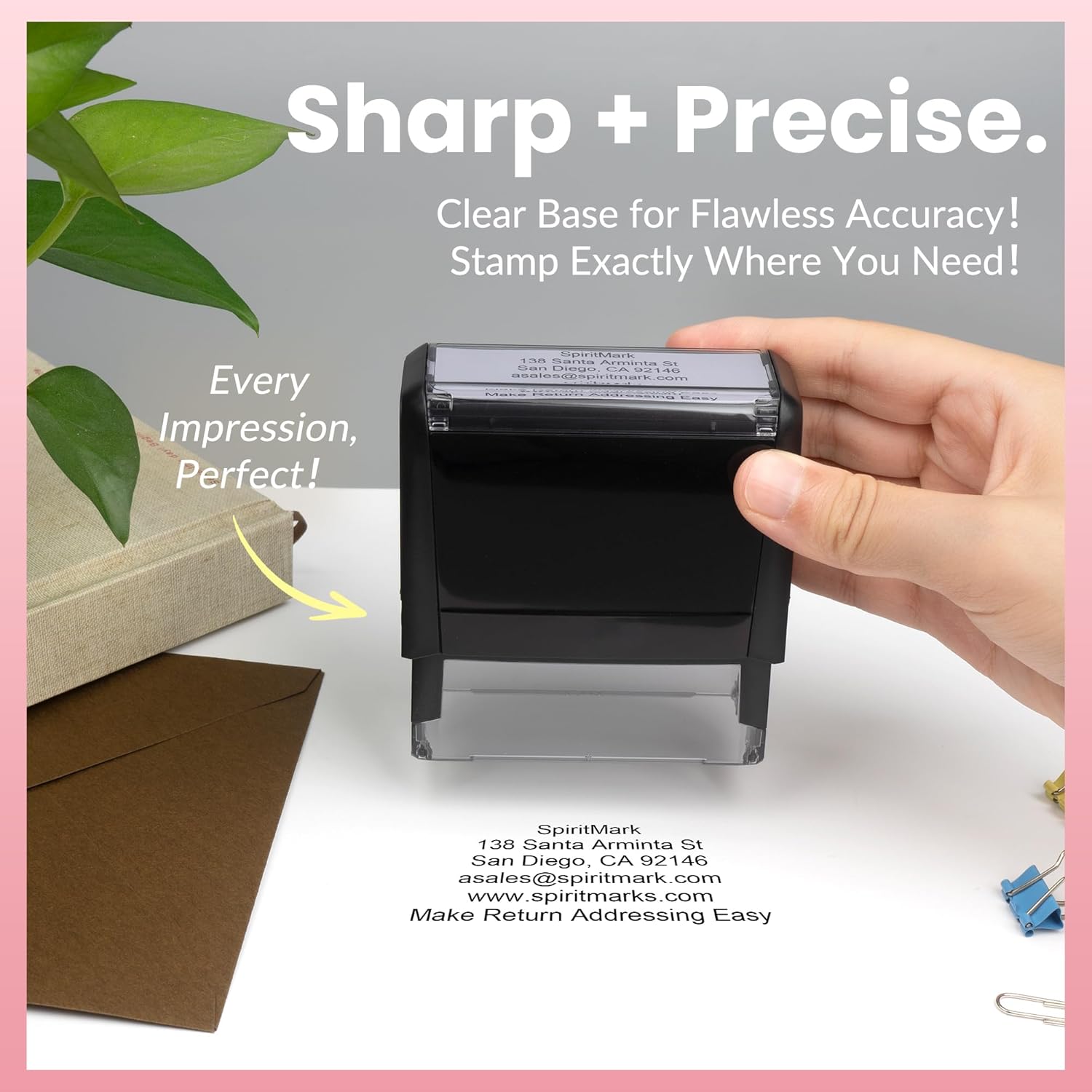 SPIRITMARK custom self-inking stamp delivers professional, personalized impressions in seconds—without ink pads or messy smears. Designed for frequent use, this high-performance rubber stamp features a refillable ink pad and durable mechanism that maintains sharp, dependable impressions for years. Whether you’re stamping return addresses, custom labels, or signature blocks, the precision design ensures clean, well-aligned impressions every time. Font size is automatically scaled to fit your text—so fewer words yield larger, bolder lettering; for longer messages, consider using fewer lines or upgrade to a larger stamp size. SPIRITMARK stamps are clean, convenient, and built to streamline your everyday stamping tasks.
